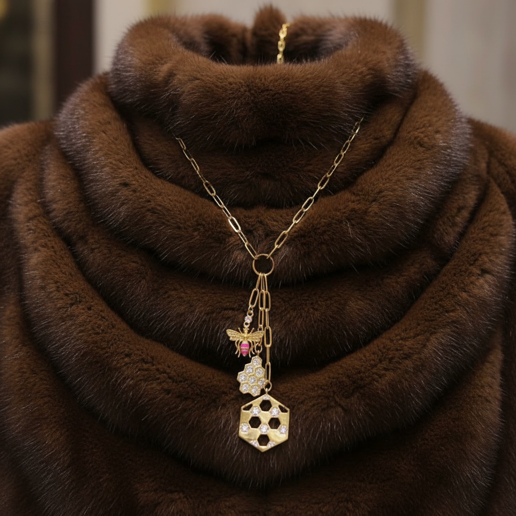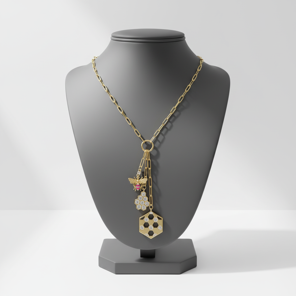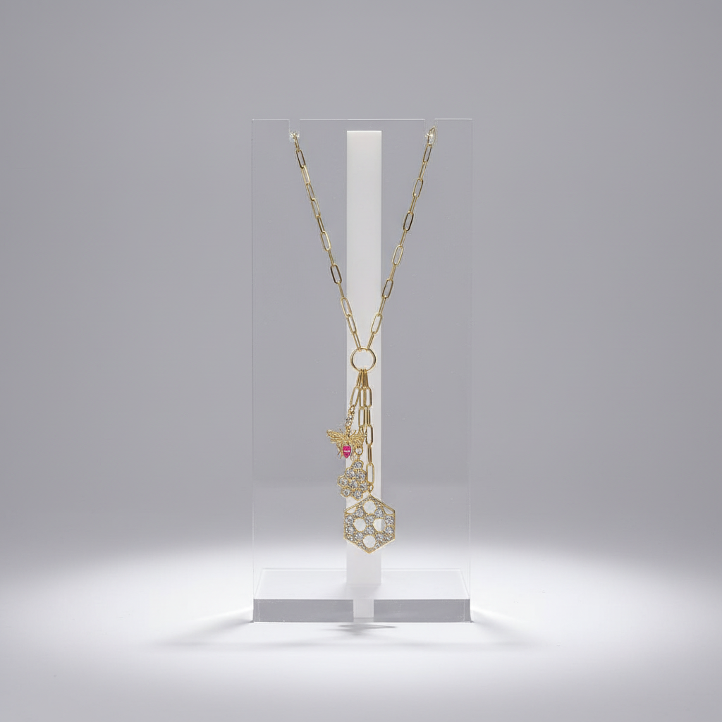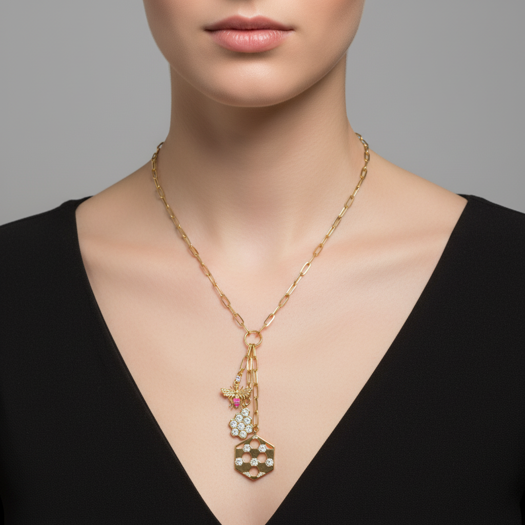 The Scuttle Bee Necklace, crafted in 18K gold-plated stainless steel, features a stylish paperclip chain paired with a unique pendant: a delicate gold and pink bee suspended above a sparkling honeycomb charm adorned with cubic zirconia stones.