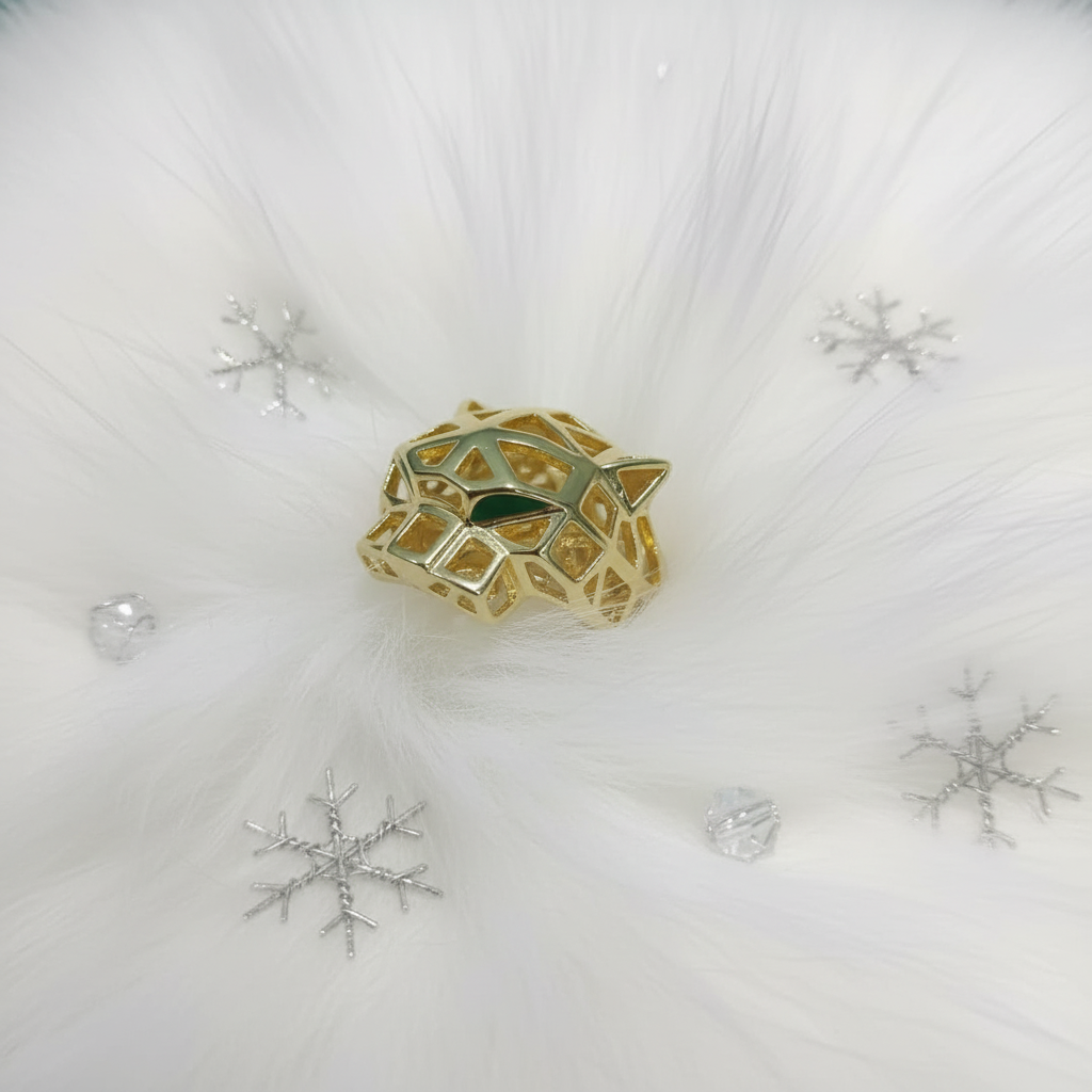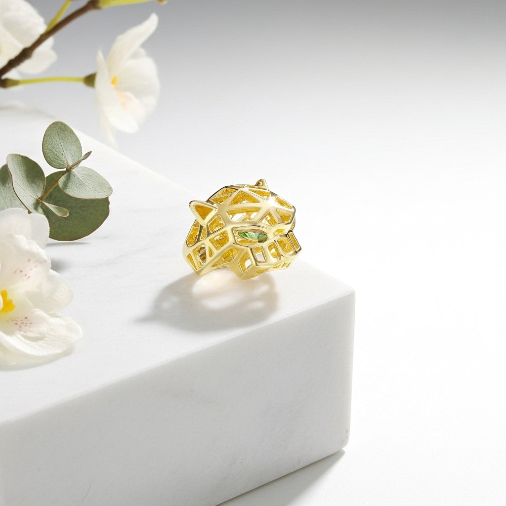 Inspired by the fierce grace of the jaguar, this striking ring blends contemporary artistry with symbolic power in a bold openwork golden silhouette.
