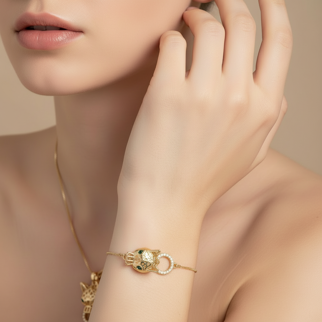 Each piece features a sculpted panther head, adorned with striking green eyes and a ring pavé-set with sparkling zircons.